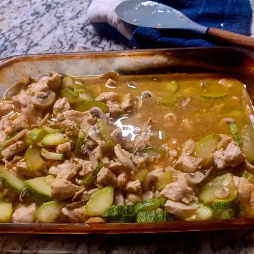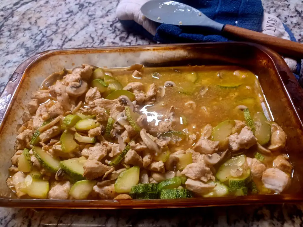 Combine everything: Remove the chicken from the oven. Add the zucchini and sautéed mushrooms to the chicken and gently mix together.