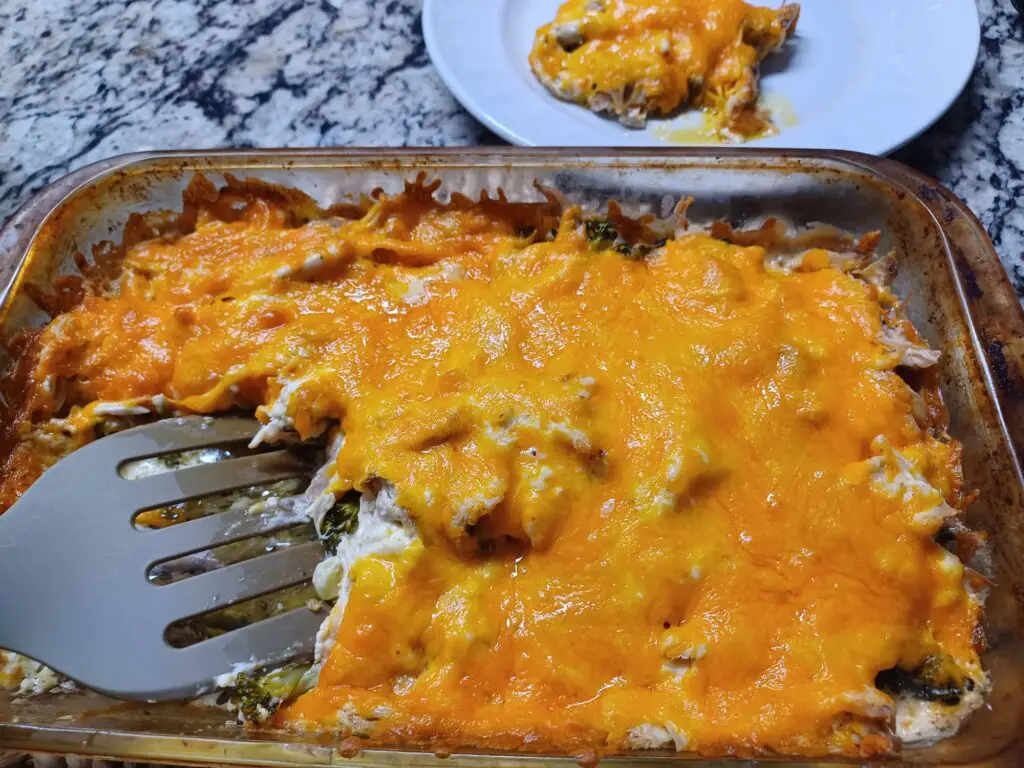 The sauce? Simple and creamy. A quick Alfredo made with cream cheese, butter, garlic, and milk comes together in minutes. Once it’s warm and smooth, I pour it over the chicken and broccoli, give everything a gentle mix, and sprinkle cheese on top.