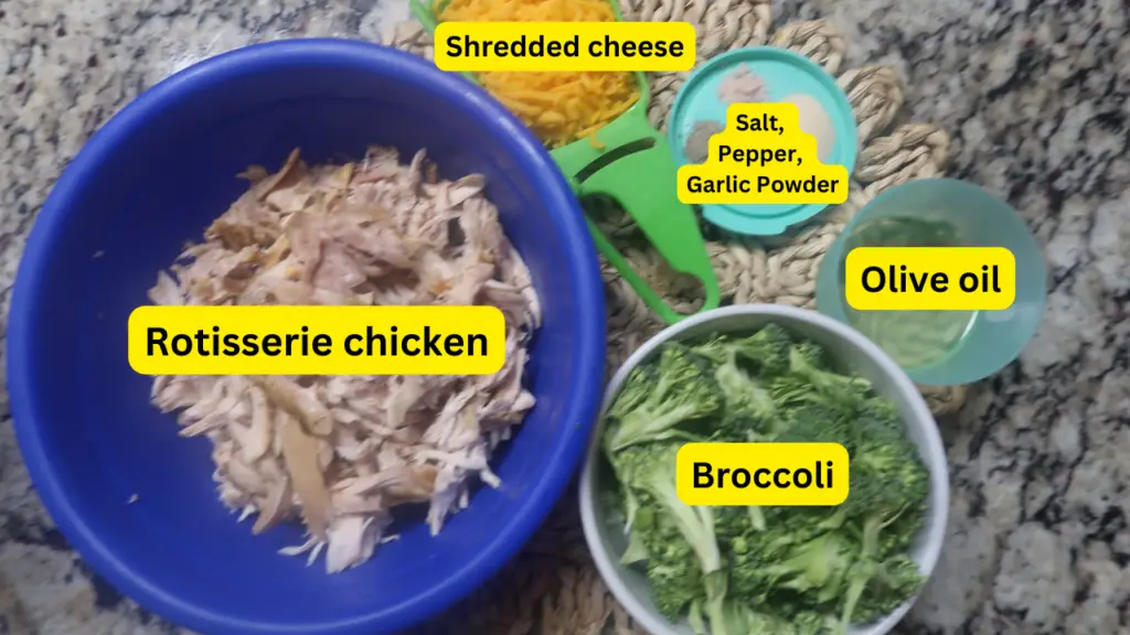 Add the chicken: Top the broccoli with shredded rotisserie chicken, then sprinkle with 2 tablespoons Parmesan cheese.