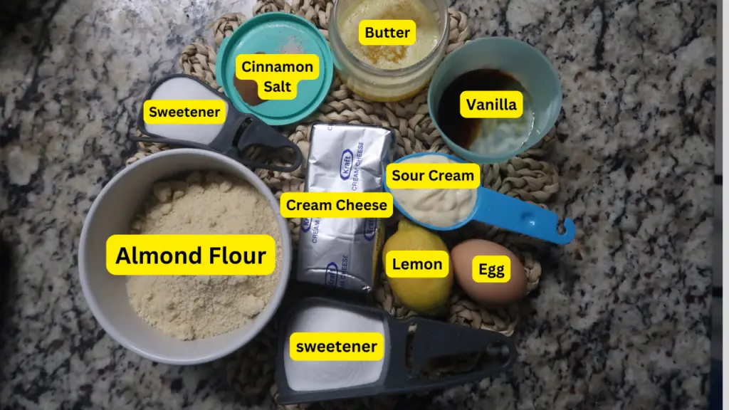 Make the cream cheese filling by whisking the cream cheese until smooth. Add the sweetener and the egg and blend well. Blend in the vanilla extract. Add in the sour cream the lemon juice, then a pinch of salt, and blend until smooth.